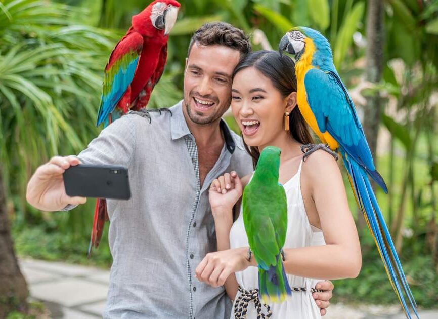 - Exotic birds up close — many roaming freely in lush, tropical gardens.